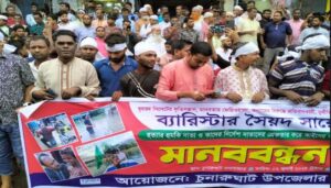 মঙ্গলবার (২ জুলাই) বিকেলে চুনারুঘাট মধ্যবাজারে মানববন্ধন ও সমাবেশ থেকে তারা হুমকি দাতাদের দ্রুত সনাক্ত এবং তাদের আইনের আওতায় আনার দাবি জানিয়েছেন।