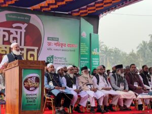 দলের আমীর নির্বাচিত হওয়ার পর এই প্রথম নিজ জেলা মৌলভীবাজারে খোলা মাঠে কর্মী সমাবেশে ভাষণ দিলেন ডা. শফিকুর রহমান। বক্তব্যের শুরুতেই জুলাই আন্দোলনের বীর সৈনিকদের একটি গান উচ্চারণ করে বলেন, ‘বুকের ভিতর তুমুল ঝড়, বুক পেতেছি গুলি কর,।