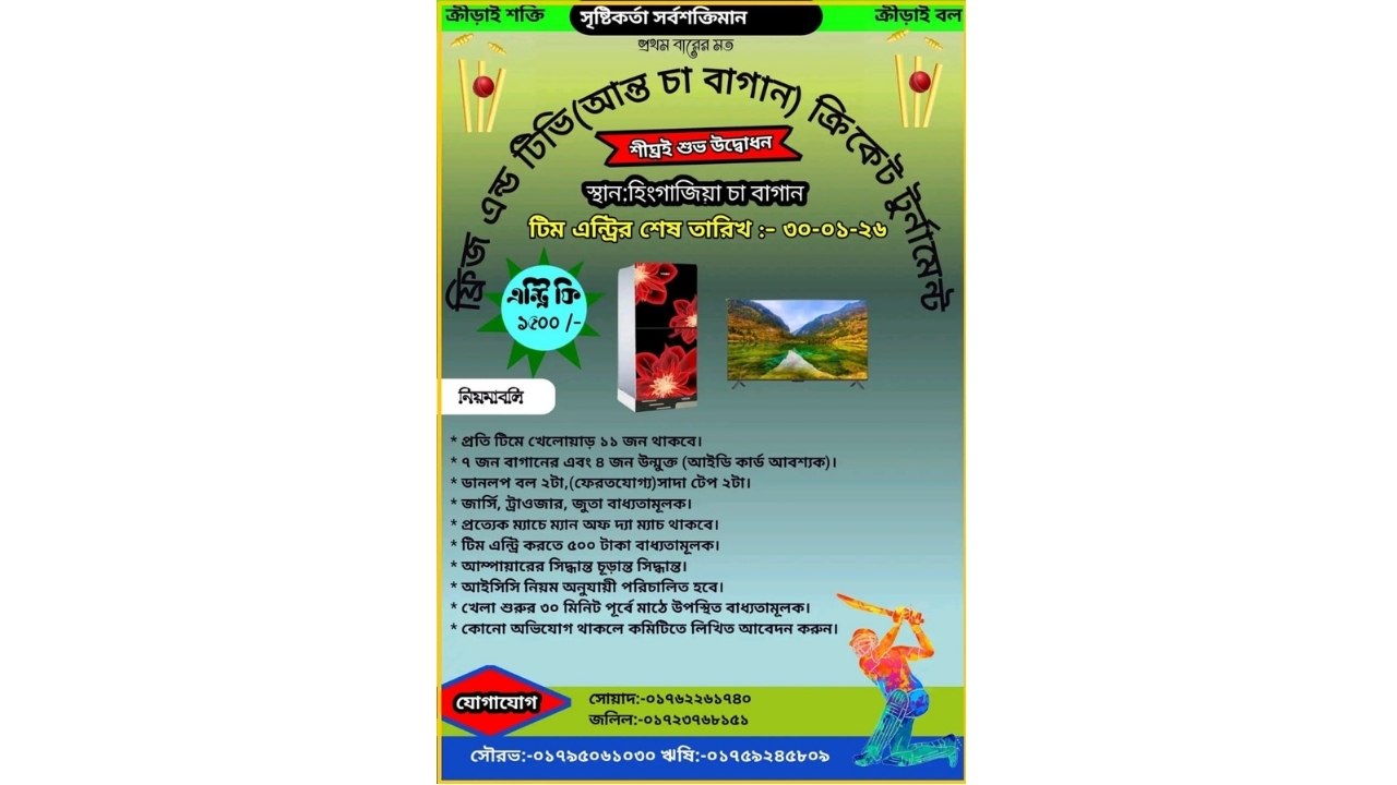 খেলাধুলাই শক্তি, খেলাধুলাই বল—এই স্লোগানকে সামনে রেখে মৌলভীবাজারের কুলাউড়া উপজেলার হিঙ্গাজিয়া চা-বাগানে প্রথমবারের মতো আয়োজিত হতে যাচ্ছে আন্তঃ চা বাগান ক্রিকেট টুর্নামেন্ট।